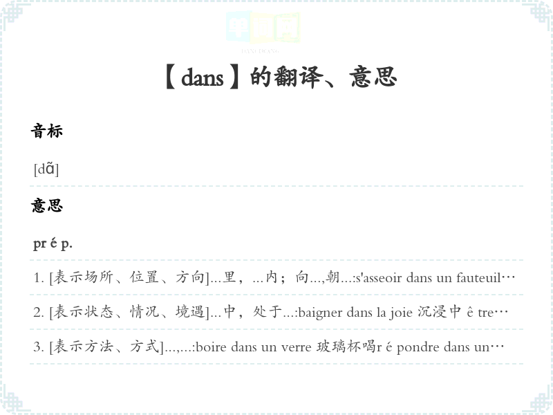 [表示时间]...时候,...时期;过...后,...之后:dans sa jeunesse 他年轻时dans le temps 以前,往日dans la suite 后来dans peu 过不久dans l'année 年内dans un an 过一年后