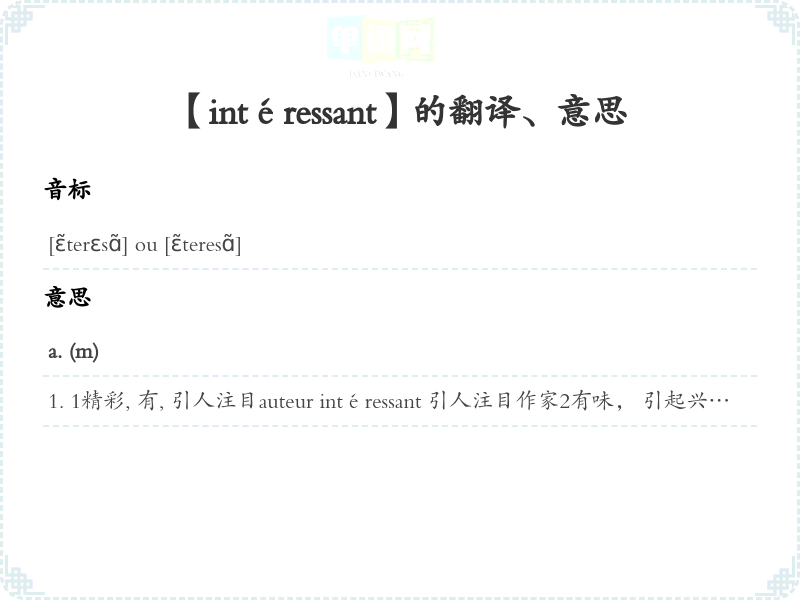1精彩, 有, 引人注目auteur intéressant 引人注目作家2有味, 引起兴ouvrage intéressant 有作品3值得关心, 值得关怀un cas social intéressant 一个值得关注社会情况4有利, 有好处un client intéressant 大买主