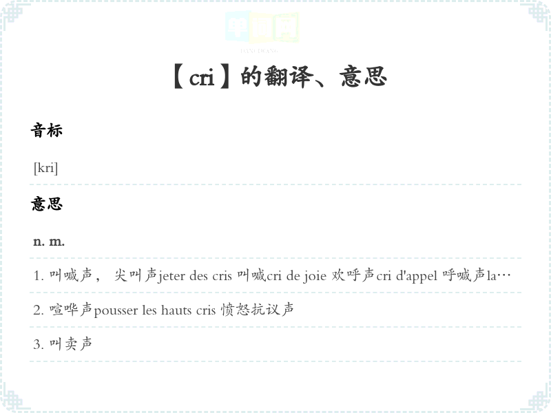 叫喊声, 尖叫声jeter des cris 叫喊cri de joie 欢呼声cri d'appel 呼喊声la dame avait poussé un cri étouffé (Sartre) 那位妇人低声喊一下(萨特)