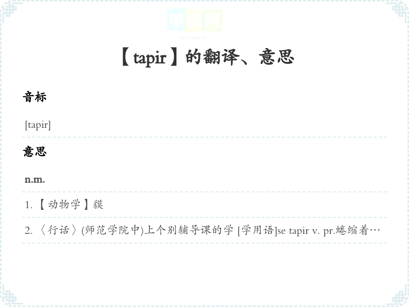 〈行话〉(师范学院中)上个别辅导课的学 [学用语]se tapir v. pr.蜷缩着身体躲藏; [转]隐藏, 潜伏:se tapir dans un coin 蜷缩着身子躲在角落里