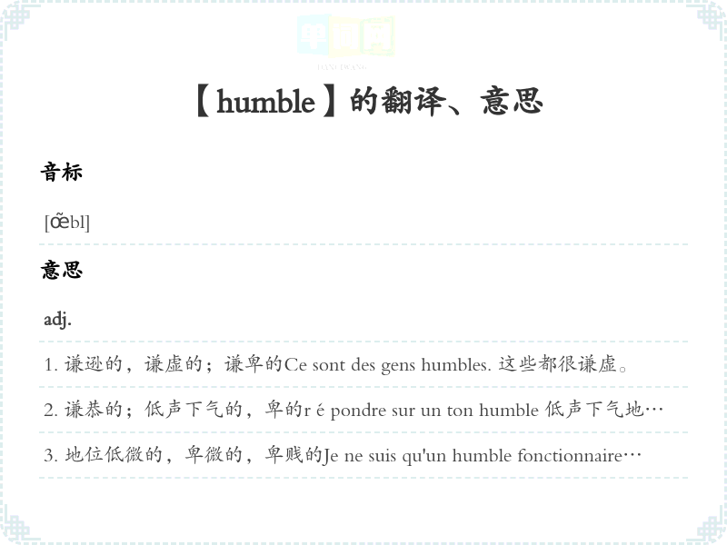 谦逊的,谦虚的;谦卑的Ce sont des gens humbles. 这些都很谦虚。