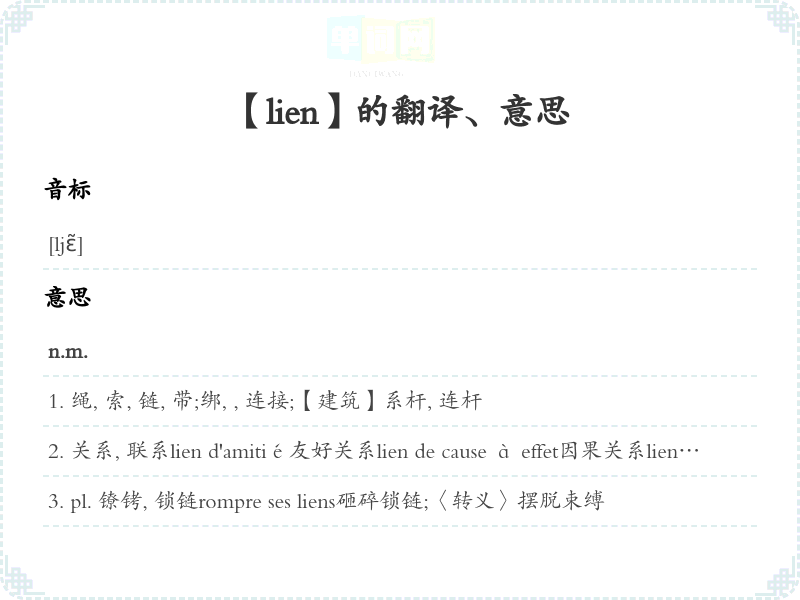 【lien】 助记:、 词根:、 联想:、 动词变化:、 形容词变化:、 近义词:、 反义词: 联想词