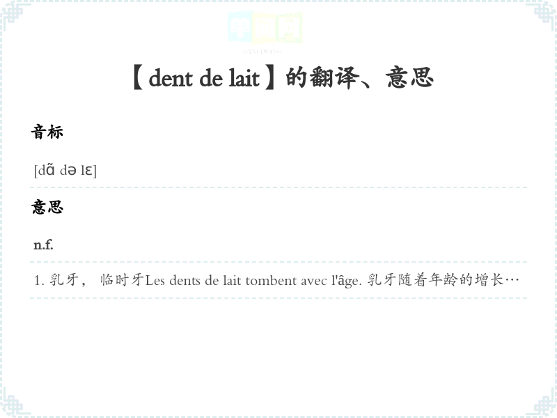 【dent de lait】 助记:、 词根:、 联想、 名词化:、 词化:、 形容词化:、 近义词、 反义词、 同音、近音词 联想词