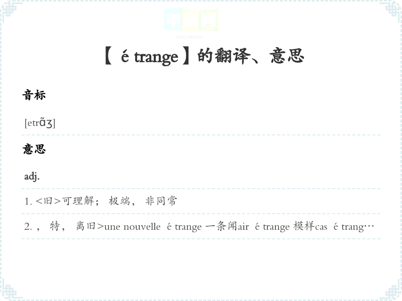 【étrange】 联想:、 副词变化:、 名词变化:、 近义词:、 反义词: 联想词