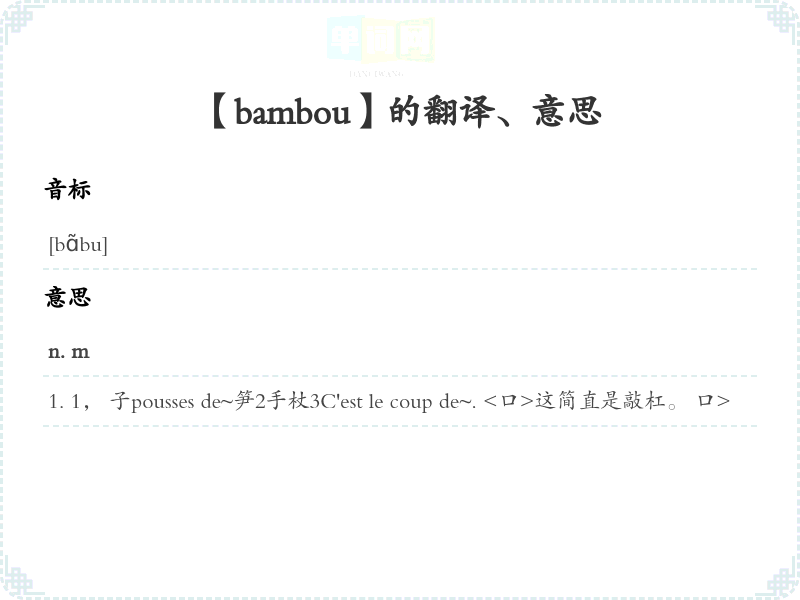 1, 子pousses de~笋2手杖3C'est le coup de~. <口>这简直是敲杠。 口>