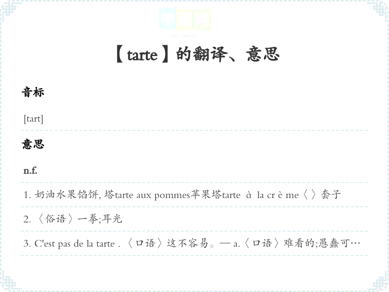 C'est pas de la tarte . 〈口语〉这不容易。— a.〈口语〉难看的;愚蠢可笑的;蹩脚的