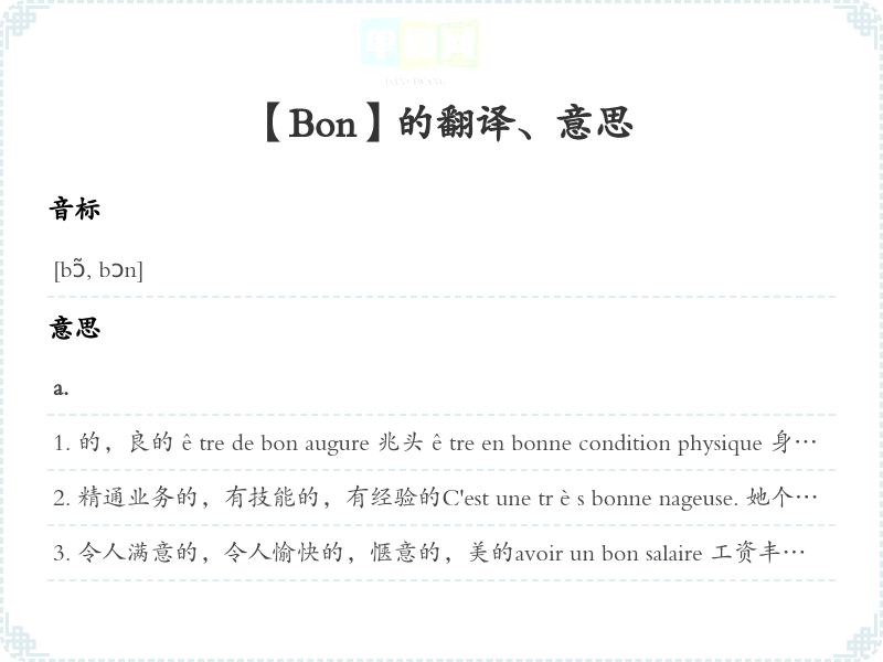 放在句首,表示祝愿Bonnes vacances ! 假期愉快!Bonne continuation 再接再励Bon rétablissement ! 早日康复!Bon voyage ! 旅行愉快!adv.sentir bon 香, 有香味 tenir bon 坚持coûter bon 价格昂贵Il fait bon. 气候宜人。天气。Il fait bon dans ta chambre. 你的卧室很温馨。Il fait bon se promener. 散散步非常愉快。Il ne fait pas bon avoir affaire à cet homme. 同个人打交道真愉快。同个人打交道真危险。n.m.