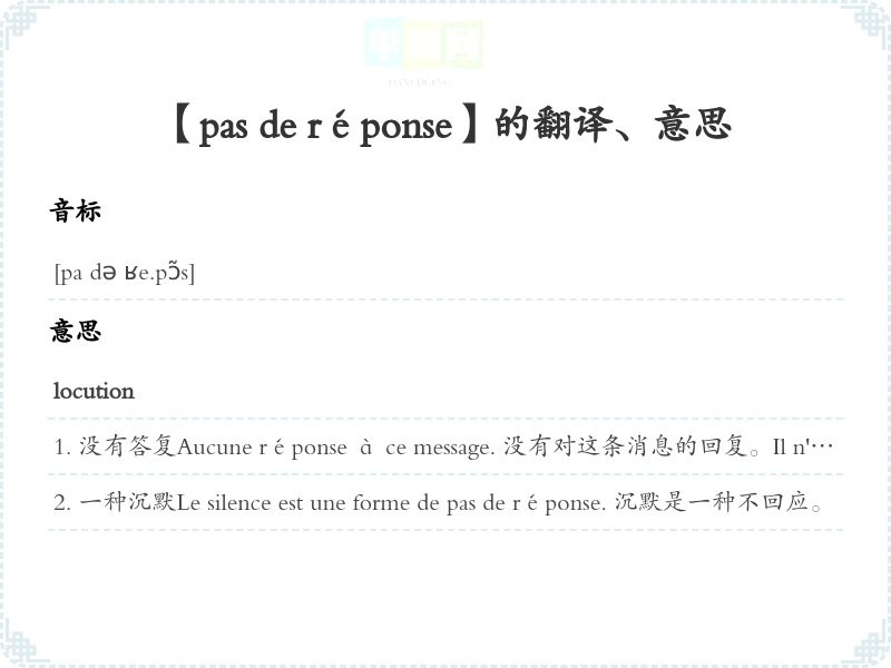 没有答复Aucune réponse à ce message. 没有对这条消息的回复。Il n'y a pas de réponse à ma question. 我的提问没有得到回复。
