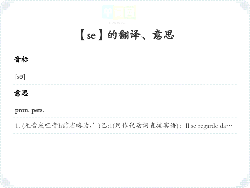 (元音或哑音h前省略为s’)己:1(用作代动词直接宾语):Il se regarde dans la glace. 照镜子2(用作代动词接宾语):Il ne se lest pas fait dire deux fois. 不用人家讲第二遍Ils se nuisent. 们两败俱伤。 Ils se sont donné quelques jours pour réfléchir. 们给己几天时来考虑。3(用来构成纯粹代动词):Il s'en moque. 毫不, 不放心上Elle s'en va. 她走了。4(用来构成起被动作用代动词):Cela ne se dit pas ainsi en français. 法语里不是这样讲5(用于无人称代动词中):Il se peut que je vienne. 我可能来. Il s'en faut de beaucoup. 还差很多。 Comment se fait-il que vous vous taisiez?怎么您一言不发啦?6(代替son, sa, ses):Il se lave les pieds. 洗脚(即 Il lave ses pieds. )sexercer la mémoire锻炼记忆力7(特殊用法):Il se meurt. 正死去。 [与Il meurt. (死了)不同] -- (se faire, envoyer等动词后可省略):envoyer promener qn 把某人撵走