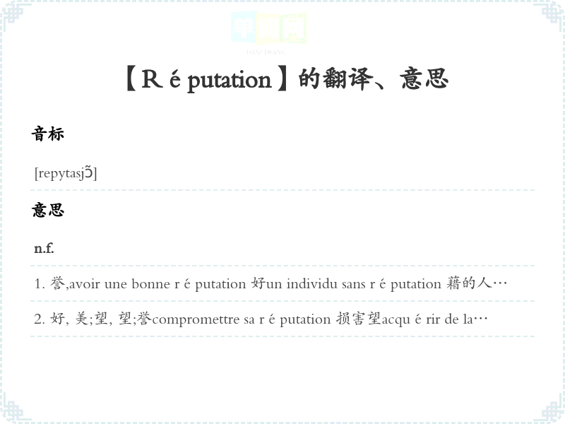 好, 美;望, 望;誉compromettre sa réputation 损害望acquérir de la réputation 获得望réputation d'une maison de commerce一家商行的誉perdre qn de réputation 败坏某人的誉