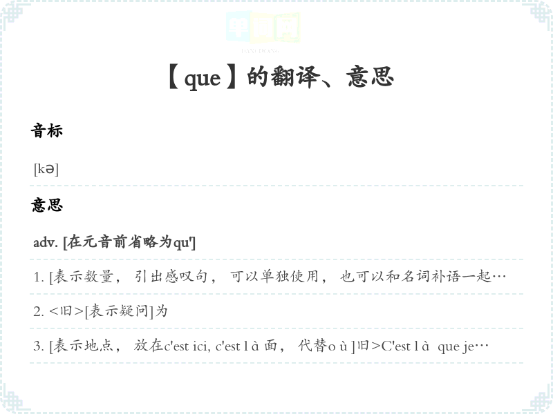 [在并列的状语从句中, 如引出面从句的连词[quand, comme, si等]或连词短语[après que, afin que等]与第一个从句的相同, 可以用que来代替]Puisque je l'affirme et que je donne des preuves, on peut me croire. 既然我说了, 我又提供了证据, 这下可以相信我了。[当que代替si时, 从句中动词用虚拟式]Si la situation évoluait ou que vous changiez d'avis, tenez-moi au courant. 如果情况发生变化或您改变主意, 请别忘了告诉我。B. [引出虚拟式的独立句, 表示祝愿、愿望、命令、假定等]Que la paix soit avec vous! 但愿你们心灵安宁!Que tout le monde sorte! 大家都出去!Qu'il entre! 让他进来!C. [作为赘词, 在一些惯用语中起加强语气的作用]Vous ne le connaissez pas?—Que si!您不认得他吗?—不, 认得。 Je chante si mal!—Oh!Que non!我唱得多糟!—啊!不, 很好!que si [在书面语中放在句首,强调si的语气]:Que si vous en doutez, je donnerai des preuves. 假如您对此有所怀疑,我将拿出证据来。Peut-être que oui. 也许是的。Voilà qu'on sonne. 有人按铃了。C'est à vous que je m'adresse. 我是在对您讲。C'est grâce à son aide que nous avons pu y arriver. 正是由于他的帮助,我们才能到达那儿。D. [与一些介词、连词或副词并用,并组成连词短语]afin que 为了à condition que 只要, 只需à mesure que 随着de façon que 使得depuis que 自从parce que 因为作关系代词时Que作直接宾语, 性数和先行词一致。 所以如果从句中如果有以avoir构成的复合时态, 过去分词要与que 性数一致。J'ai vu la maison que vous avez visitée. Il lit la lettre que j'ai écrite. La leçon que nous avons apprise cette semaine n'est pas difficile. Qui 作主语: J'ai vu cette maison qui vous plaît beaucoup. Où 作状语: J'ai vu la maison où vous avez habité. 时间状语:Il faisait beau le jour où nous somme allés chez elle. C'est l'heure où finissent les cours.ne...que loc.adv.仅仅, 只Il n'y a que dix minutes qu'il est là. 他来了只有十分钟。ne faire que (+inf.) 老是,总是;只是ne faire que de (+inf.) 刚刚que...neloc.conj.