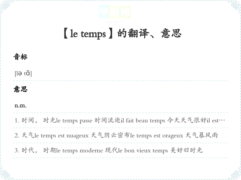 时间, 时光le temps passe 时间流逝il fait beau temps 今天天气很好il est temps de partir 该走了