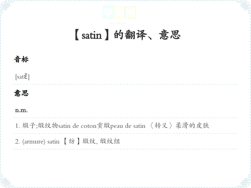 缎子;缎纹物satin de coton贡缎peau de satin 〈转义〉柔滑的皮肤