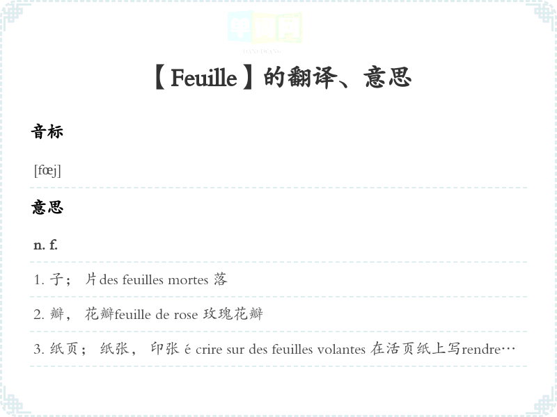 纸页; 纸张, 印张écrire sur des feuilles volantes 在活页纸上写rendre feuille blanche à un examen 考试交白卷feuille imprimée à remplir 表格