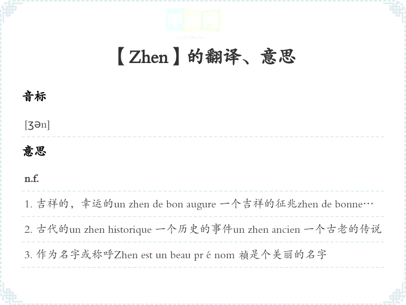 吉祥的,幸运的un zhen de bon augure 一个吉祥的征兆zhen de bonne fortune 幸运的事célébrer un zhen 庆祝一个吉祥的日子