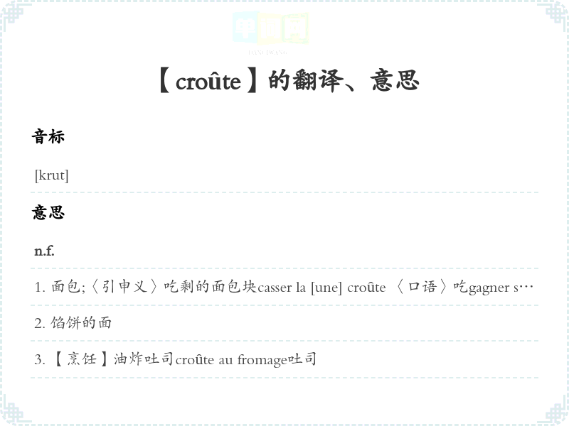 【croûte】 联想:、 近义词:、 反义词: 联想词