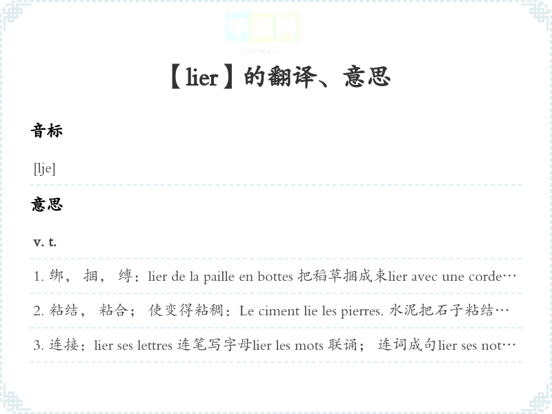 结合, 建立(联系等):lier amitié avec qn 与某人结成友谊lier connaissance avec qn 结识某人lier conversation avec qn 开始与某人交谈Un objectif révolutionnaire commun nous a liés. 一个共同目标把我们结合在一起,