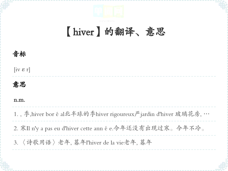 , 季,hiver boréal北半球的季hiver rigoureux严jardin d'hiver 玻璃花房, 温室sports d'hiver 季运动 [如溜冰、滑雪等]Jeux olympiques d'hiver 季奥林匹克运动会vacances d'hiver 寒假plantes d'hiver 季生长的植物blé d'hiver 小麦