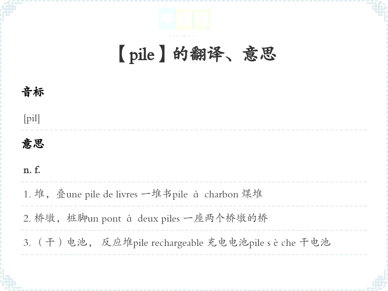 【pile】 联想:、 近义词:、 反义词: 联想词