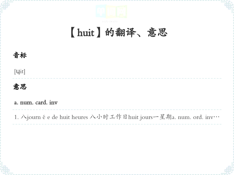 八journée de huit heures 八小时工作日huit jours一星期a. num. ord. inv第八Henri VIII亨利八世n. m. inv1 八; 八字Deux fois huit, seize.二乘八于六。2(一个月份的)八日; 八点钟; (房屋或房间的)八号Je partirai le huit du mois prochain.我将于下个月8号动身。J'habite au huit de la rue Boileau.我住在布瓦洛街8号。3(的)八点le huit de carreau方块84 8字形le grand huit翻滚过山车