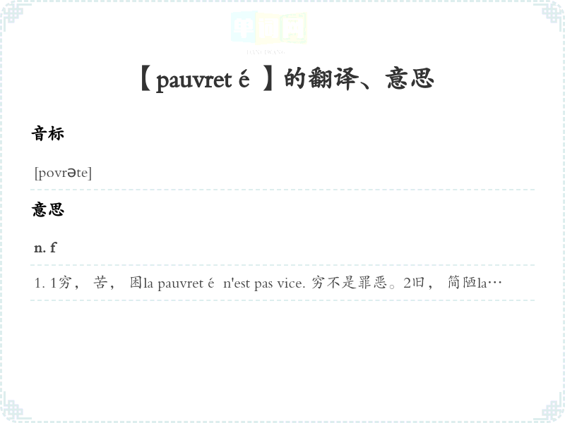 1穷, 苦, 困la pauvreté n'est pas vice. 穷不是罪恶。2旧, 简陋la pauvreté d'un quartier ouvrier 一个工人旧的面貌3瘠, 乏la pauvreté du sol 土壤的瘠4平庸、无聊的话或行为; (作中)平庸、无聊的部分, 浅薄dire des pauvretés 说无聊的话