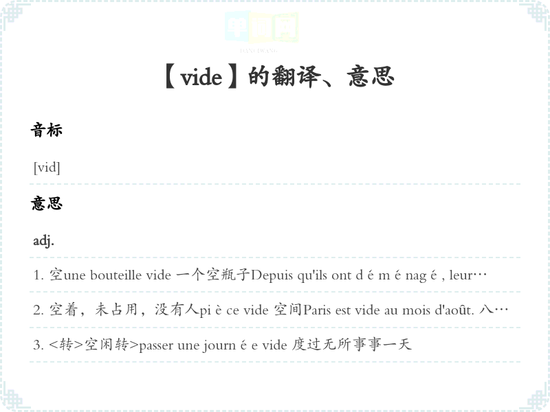 【vide】 派生:、 近义词:、 反义词: 联想词