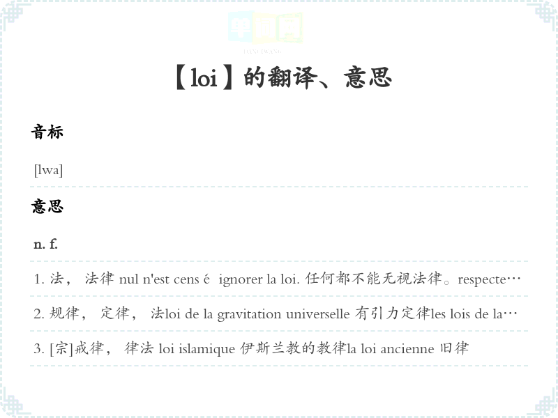 规律, 定律, 法loi de la gravitation universelle 有引力定律les lois de la gravité 重力法la loi de la jungle 弱肉强食的法