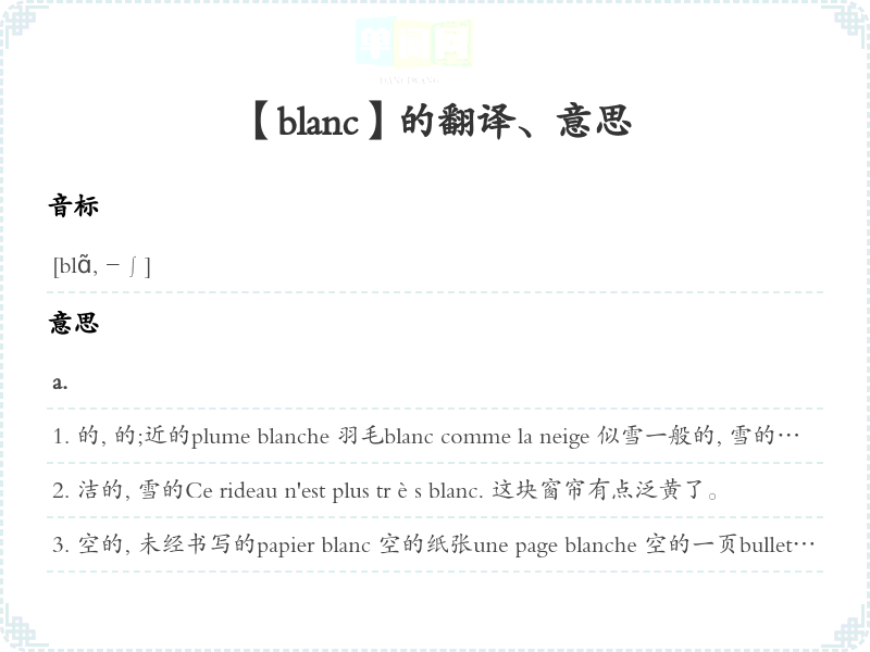 【blanc】 词根:、 派生:、 联想:、 动词变化:、 形容词变化:、 近词:、 反词: 联想词