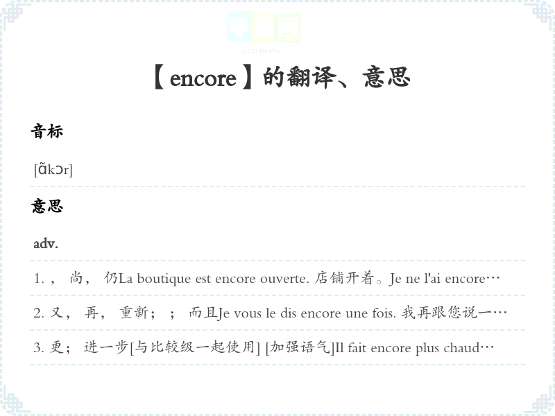 又, 再, 重新; ; 而且Je vous le dis encore une fois. 我再跟您说一遍。Prenez encore du poulet. 再吃些鸡肉吧。Non seulement il est bête, mais encore prétentieux. 他不仅愚蠢,而且很傲慢。