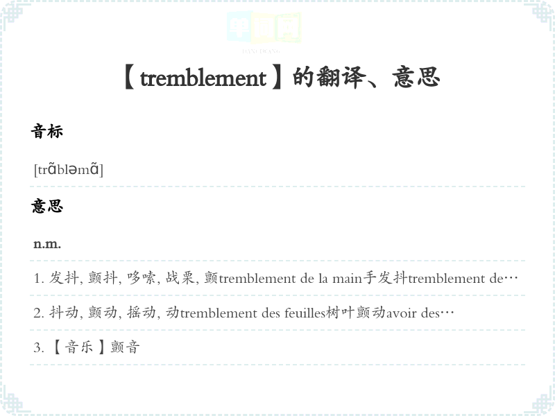 【tremblement】 联想:、 近义词:、 反义词: 联想词