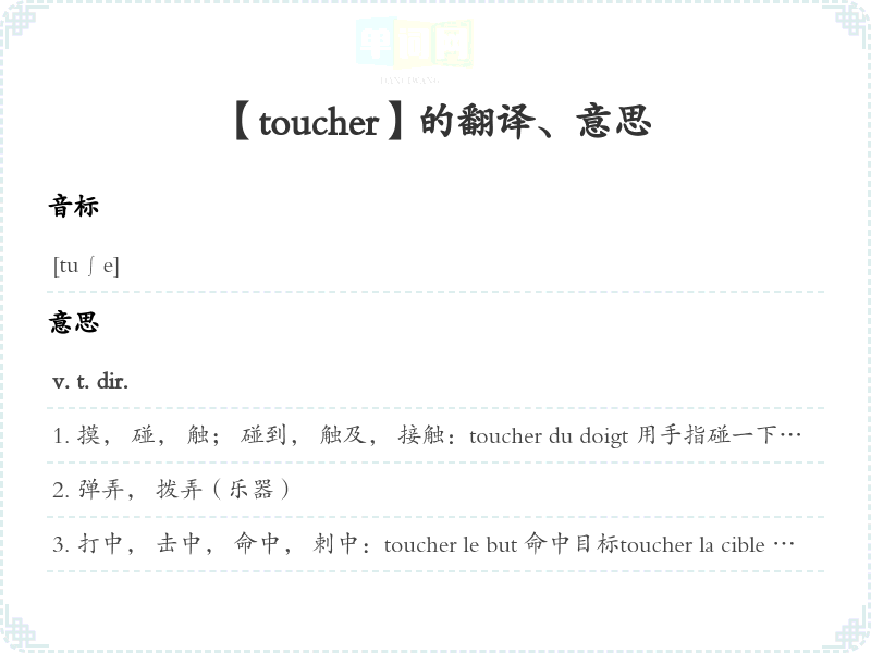 摸, 碰, 触; 碰到, 触及, 接触:toucher du doigt 用手指碰一下toucher délicatement des fruits pour juger de leur maturité 轻轻地摸果看看是否toucher la main à qn 某人握手toucher le porte (船舶)进港靠岸toucher le sol (飞机)着陆toucher le sol des deux épaules (摔角选手)两肩触地ne pas toucher terre 脚不着地[喻]