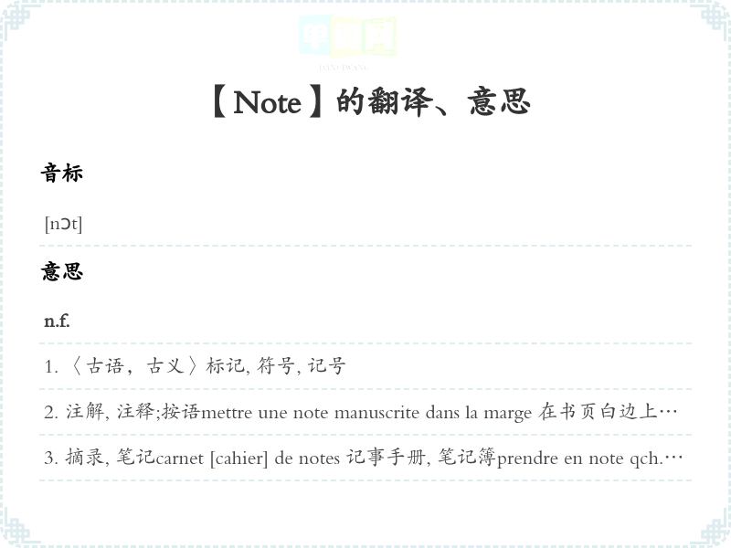 【音乐】音符;音;琴键note basse [haute] 低 [高] 音note juste 准确的音;〈义〉协、恰当之处fausse note 走, , 〈义〉谱, 趣味正宗donner la note 定音, 起音;〈义〉定子:forcer la note 夸大, 夸张être dans la note 是协的, 是恰当的, 是合适的chanter la même note 唱老changer de note 改变口气, 改变态度Cela change la note. 这使情况起了变化。