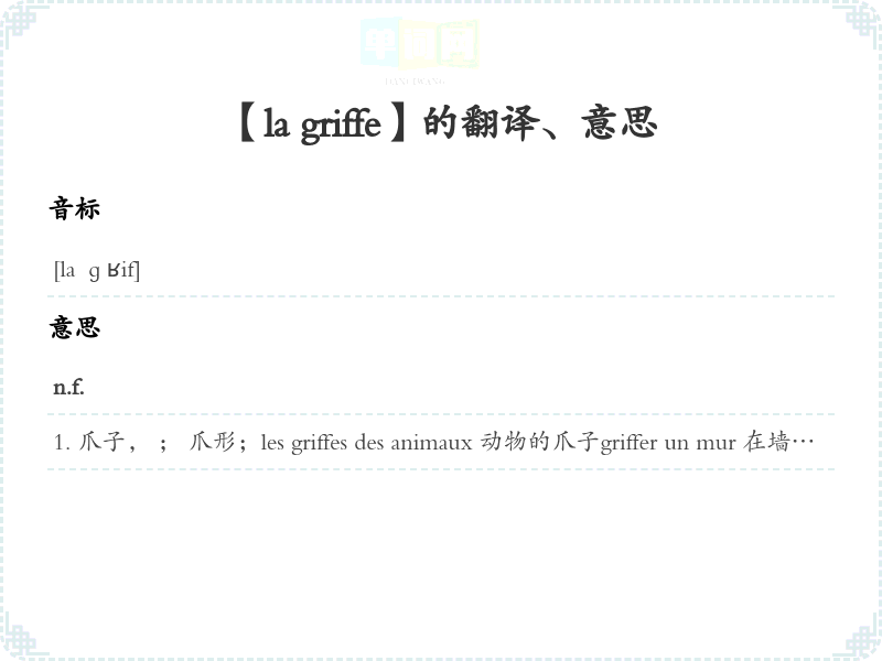 【la griffe】 助记:、 词根:、 联想、 名词化:、 形容词化:、 近义词、 反义词、 同音、近音词 联想词