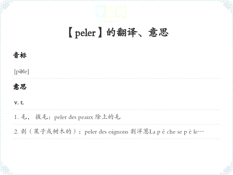 剥(果子或树木的):peler des oignons 剥洋葱La pêche se pèle facilement. 桃子很容易剥。 peler un fruit (多用于水果)éplucher les légumes (多用于蔬菜)v. i.脱:dos qui pèle après un coup de soleil 因暴晒太阳而脱的背vt.1毛, 拔毛 2剥(果子或树木的)vi.1脱 2~(de froid)<口>很冷口>