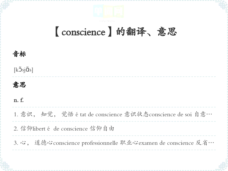 意识, 知觉, 觉悟état de conscience 意识状态conscience de soi 自意识perdre conscience 失去知觉,昏倒reprendre conscience 恢复知觉,苏醒conscience politique 政治觉悟