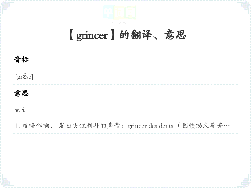 吱嘎作响, 发出尖锐剌耳的声音:grincer des dents (因愤怒或痛苦等)得咯咯响essieux qui grincent 发出嘎吱吃声的车轮La chauve-souris grince. 蝙蝠吱吱叫。