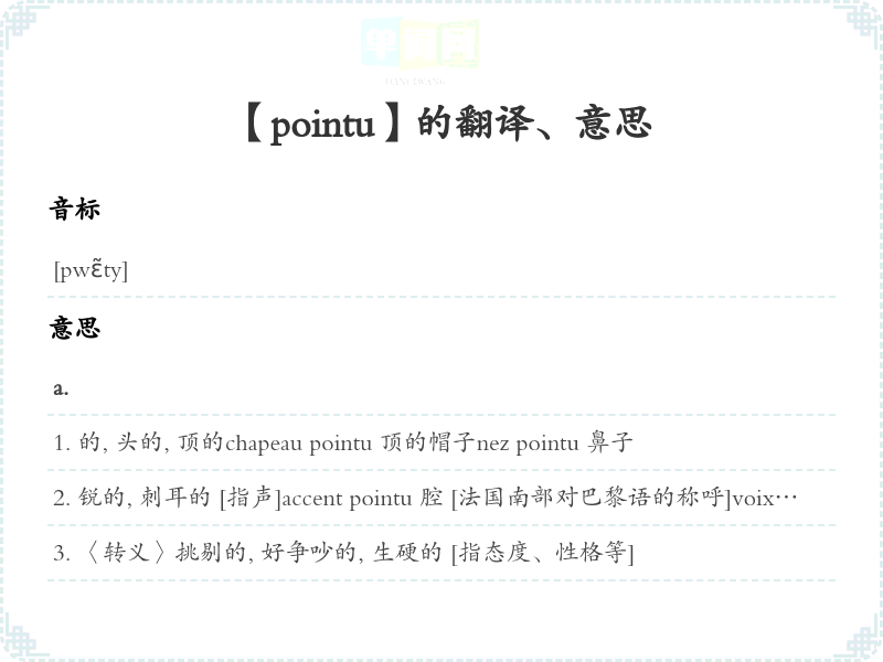 锐的, 刺耳的 [指声]accent pointu 腔 [法国南部对巴黎语的称呼]voix pointue刺耳的嗓门