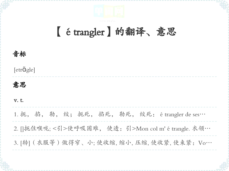 [转]阻止, 抑制; 使破产, 破坏, 毁坏:étrangler un procès 草草了结一件诉讼étrangler la presse 禁止有出版自由