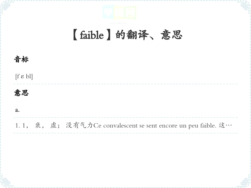 1, 衰, 虚; 没有气力Ce convalescent se sent encore un peu faible. 这位正在康复病人仍然觉得有些虚。2脆, 固, 结实, 牢s'appuyer sur une voûte faible 靠在一个结实拱门上3小, 力量单薄, 无能为力4<旧>智力差5成绩差6差[指文艺作品等]; 无说服力, 无力[指论据等]7懦, 软, 脆, 意志薄; 容 Les gens faibles sont à la merci d'autrui. 软人听凭他人支配。8微, 微小; 少量; 稀薄Une petite lampe électrique donnait une faible lumière. 一盏小小电灯发出微光。9 le côté[le point, la partie]~点; 缺点旧>n. m1者[用pl. 或作为集合名词]2懦人, 软人3<旧>(事物)薄之处, 固地方; <引>缺陷, 短处4<书>(人)点, 缺点; 偏爱, 嗜好书>引>旧>