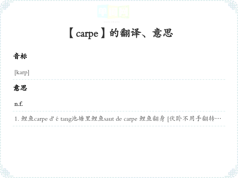 鲤鱼carpe d'étang池塘里鲤鱼saut de carpe 鲤鱼翻身 [伏卧不用手翻转身]faire des yeux de carpe 用恋慕眼光凝视être ignorant comme une carpe 知être [rester] muet comme une carpe 保持缄默bâiller comme une carpe 大声连打呵欠n.m.【解剖学】腕