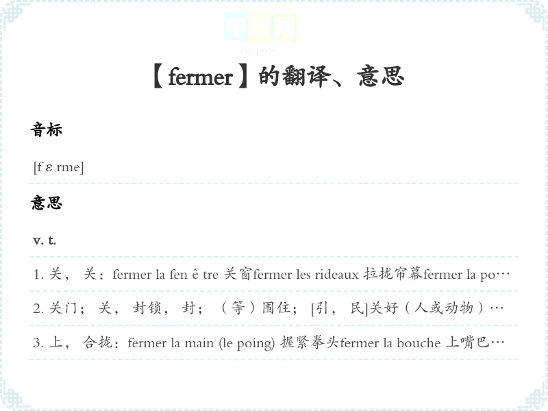 关门; 关, 封锁, 封; (等)围住; [引, 民]关好(人或动物):fermer sa chambre 关上卧室的门fermer une armoire 关好柜子fermer la boutique 关店门, 关店, 停业[宾语省略]Dépêchez-vous, on ferme! 快些, 关门!fermer les frontières 封锁边境fermer la voie [铁](信号)封线路fermer tout accès à qn 严禁和某人接触fermer son cœur à un sentiment [转]使自己不产生一种感情; 使自己不再产生一种感情fermer un jardin ()围住一个花园fermer les poules 鸡关好