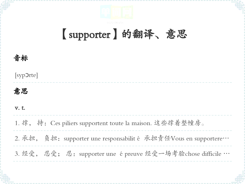 经受, 忍受; 忍:supporter une épreuve 经受一场考验chose difficile à supporter 难以忍受的事supporter qn 忍某人Il ne faut pas supporter que les enfants soient insolents. 不应该忍孩们蛮横无礼。