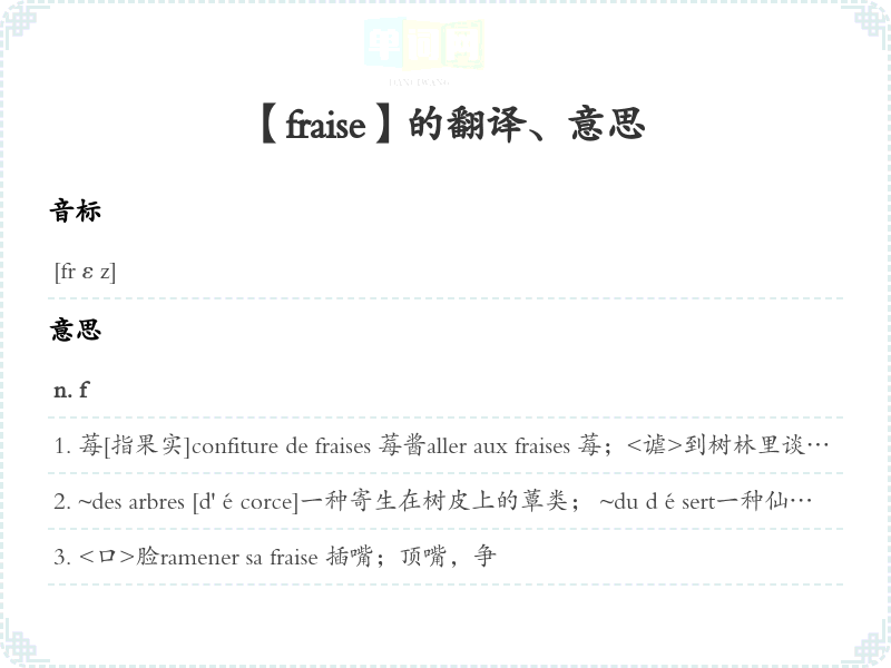 莓[指果实]confiture de fraises 莓酱aller aux fraises 莓;<谑>到树林里谈情说爱sucrer les fraises <口>发抖;<引>变得老态se payer la fraise de qqn. 讥讽某人,嘲笑某人ramener sa fraise <俗>乱插嘴俗>引>口>谑>