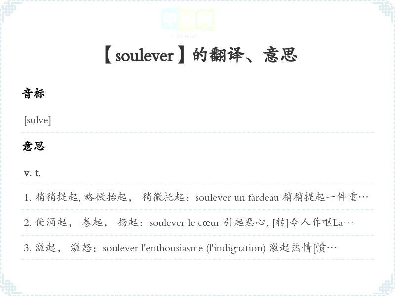 激起, 激怒:soulever l'enthousiasme (l'indignation) 激起热情[愤慨]soulever des applaudissements 激起阵阵掌声soulever l'assemble 激怒与会者, 激怒在场的人