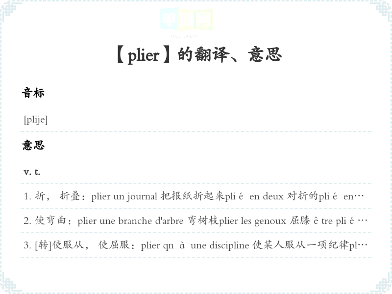 折, 折叠:plier un journal 把报纸折起来plié en deux 对折的plié en quatre 一折四的plier ses affaires [俗]收拾东西plier bagage [俗]收拾行李, 准备动身