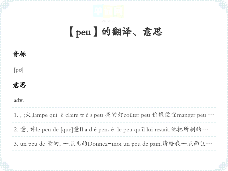 [用限定词, 没有补语, 单独使用] 量, 许, 一点点homme de peu 社会地位低下的人;低贱的人;小人vivre de peu 生活俭朴Il est content de peu .他贪。Je ne vais pas me décourager pour si peu .我会为这么一点点小事就灰心丧气。C'est peu .这了。C'est peu de...…是够的C'est trop peu dire.这样说还轻。peu s'en faut, il s'en faut de peu 几乎, 差点儿, 差Très peu pour moi.〈口语〉我感兴趣。我在乎。 [表示拒绝的客套语]un (petit) peuloc.adv.一点儿, 一下, 许, 稍微Attendez un peu .请您稍等一下。être un peu fat有点自命凡Il ne travaille pas qu'un peu .他活儿干得可。un peu plus [moins, mieux]稍微 [, 好] 一点[口语中表示语气减弱的命令或强调自己的意见]Venez ici un peu , que je vous parle.您过来一下, 我跟您讲话。[表示礼貌或讽刺][表示十分肯定]Tu ferais ça?— Un peu ! 这事你敢做吗? —那还用说!peu à peuloc.adv.一点儿一点儿地, 逐渐地, 渐渐地à peu (de chose) prèsloc.adv.大约, 差, 差离, 几乎Ils sont à peu près du même âge.他们几乎都是同年的。[用作n.m.]Il se contente d'à peu près et ne va jamais au fond des choses.他总是满足于差而从深究。 un à peu près 一种文字游戏 [以近似的词或故意改变词形的词代替]peu ou prouloc.adv.〈书面语〉, , 或或aussi [si, trop] peuloc.adv.同样 [如此, 过分]Vous m'en donnerez aussi peu qu'il vous plaira.您乐意给我就给。Il a plu, mais si peu que rien.〈口语〉下过雨了, 可是小得像没下过。dans [sous, avant] peu , avant qu'il soit peuloc.adv.久以后Il arrivera dans peu .他久就要到了。de peuloc.adv.差一点儿Vous êtes de peu arrivé le premier.您几乎是第一个到。depuis peuloc.adv.久前peu aprèsloc.adv.过了一会儿, 过久quelque peuloc.adv.〈书面语〉一些, 有点tant soit peuloc.adv.稍微一点, 很一点点Attendez tant soit peu .请稍等片刻。[用作n.m.]Donnez-m'en un tant soit peu .请给我一点点。pour un peuloc.adv.差一点, 几乎 [后接condit.]Pour un peu je partirais.我差点儿就走了。si peu queloc.conj.尽管…很 [后接subj.]Si peu de tête qu'il ait, il aurait pu penser à mon anniversaire.尽管他那么没有头脑, 我的生日他总该想到吧。si peu que ce soit论, 只要稍微一点儿pour peu queloc.conj.只要稍微… [后接subj.]Pour peu qu'on réfléchisse, on comprendra que...只要稍微思索一下, 就会理解…