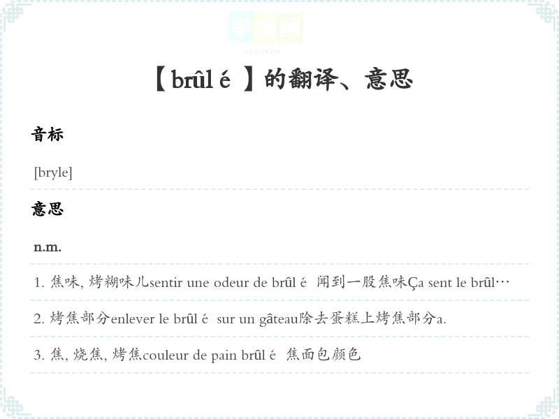 焦味, 烤糊味儿sentir une odeur de brûlé 闻到一股焦味Ça sent le brûlé .有股焦味。〈转〉事情有点不妙。