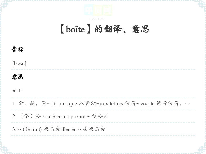 【boîte】 联想、 近义词、 同音、近音词 联想词