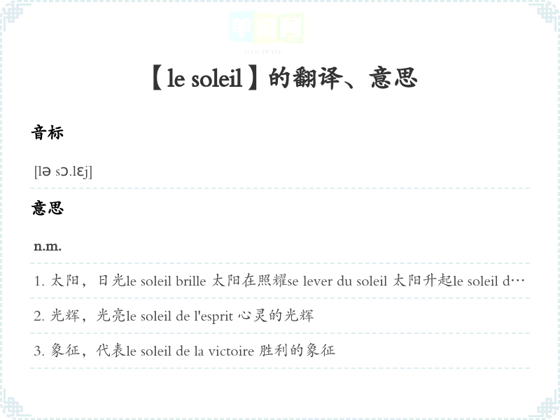 【le soleil】 助记:、 词根:、 联想、 名词化:、 动词化:、 形容词化:、 近义词、 反义词、 同音、近音词 联想词