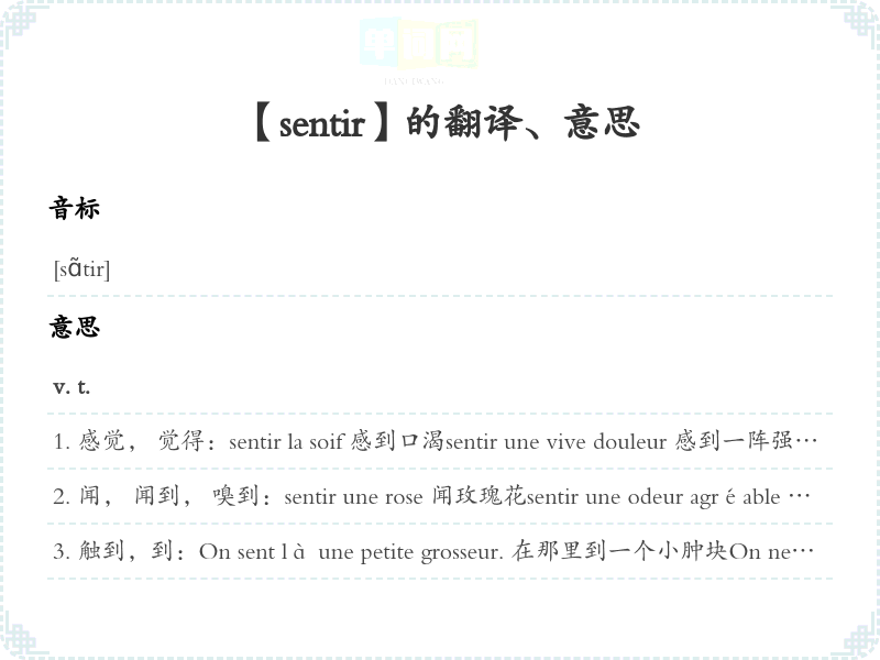 【sentir】 派生:、 用法:、 近义词: 联想词